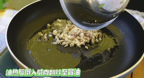2. 油热后倒入咸肉,翻炒至咸肉冒油
