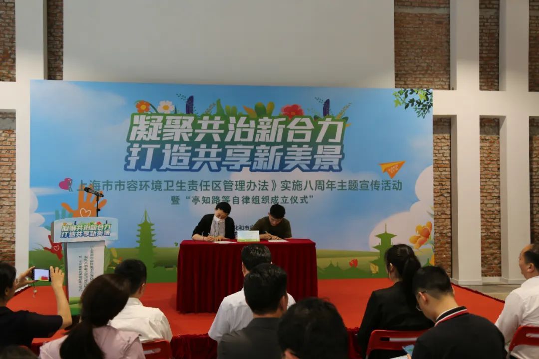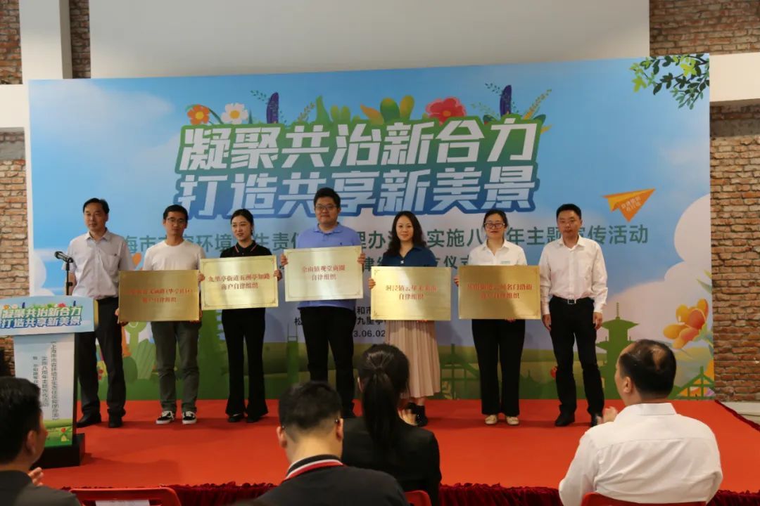 6月2日下午,松江区绿化和市容管理局联合九里亭街道,在九里工坊开展《上海市市容环境卫生责任区管理办法》实施八周年主题宣传活动,并为亭知路、文涵路、云堡未来市、云间名门沿街、观堂商圈等5家责任区自律组织授牌。