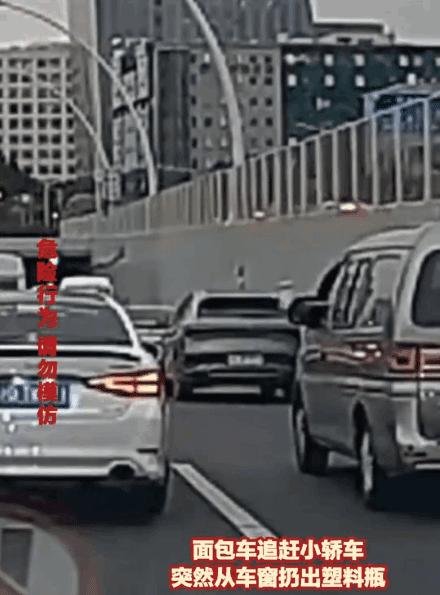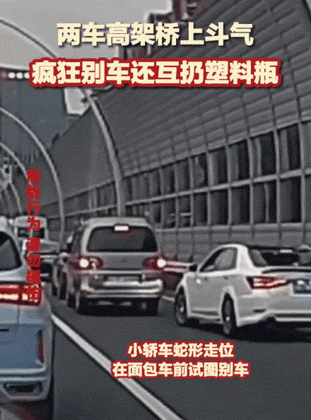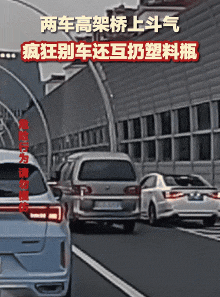 视频显示,5月31日,两车在高架桥上斗气,疯狂别车还互扔塑料瓶。期间,面包车一个别车动作,小轿车差点撞到护栏。