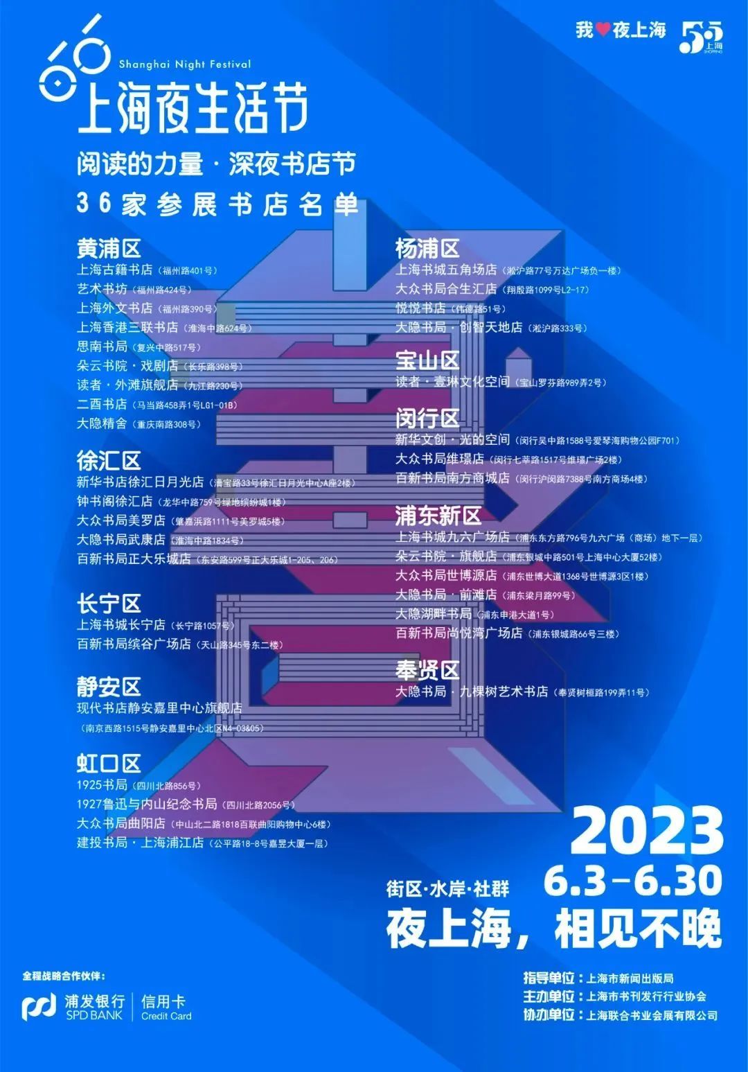 2023上海夜生活节——阅读的力量深夜书店节6月3日19:00伴随着2023上海夜生活节的开幕,而在上海36家品牌实体书店开启。6月3日至4日,36家书店将集中延时营业至22时。