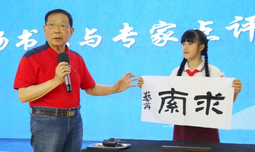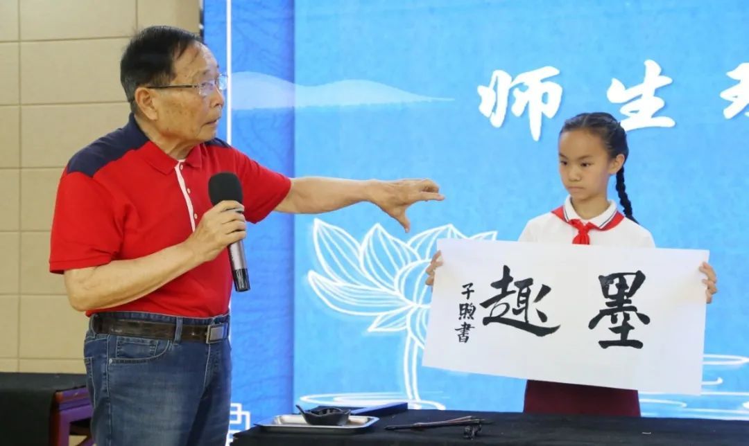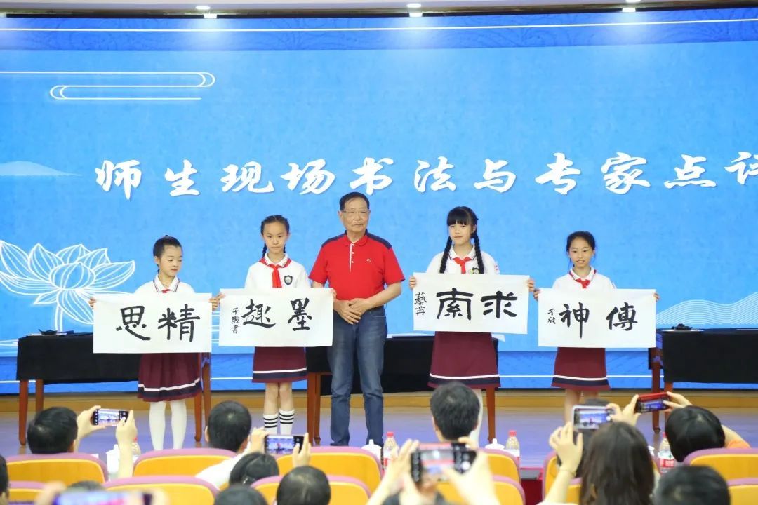 刘兆麟老师当场泼墨挥毫,与九亭第五小学的四位“小小书法家”同台创作,并进行点评。
