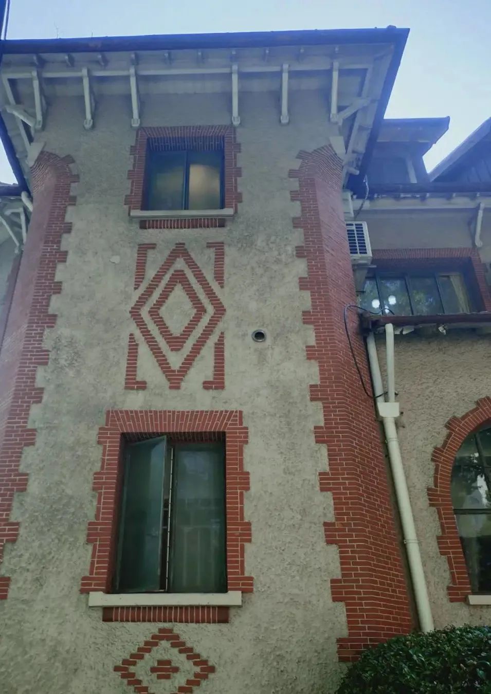 建筑半地下室外墙为仿石饰面,但石面以上用细沙卵石墙面,窗口及墙隅镶清水红砖,竖窗间有红砖砌成的四边形装饰。