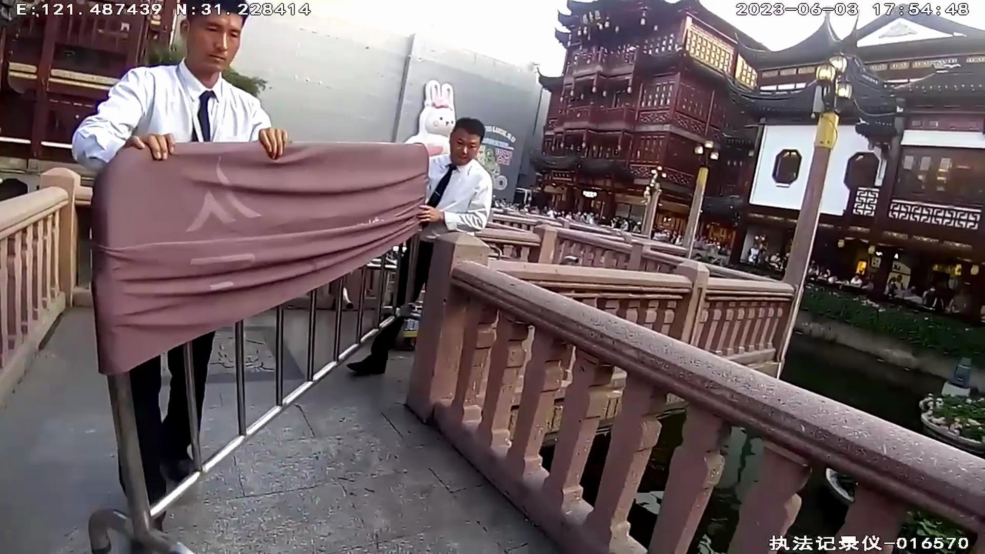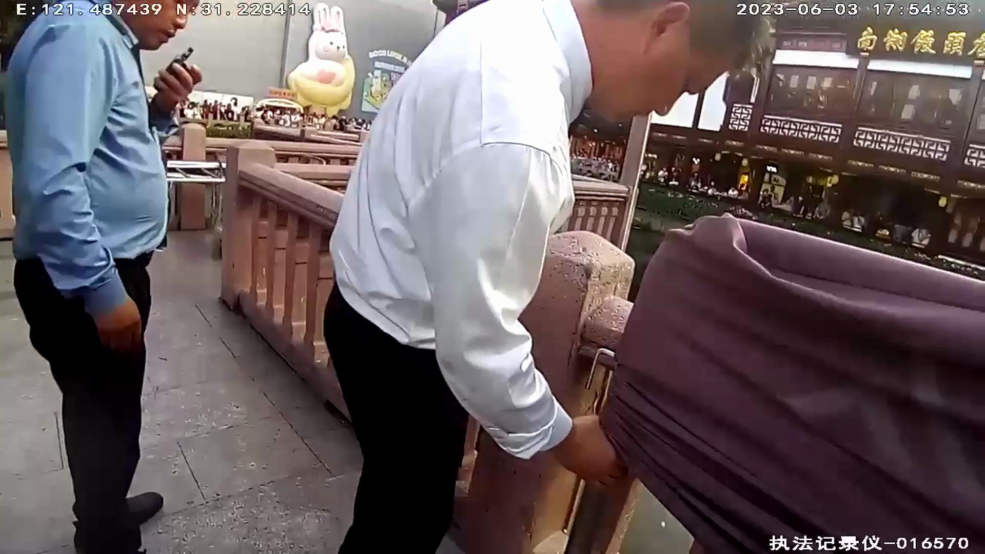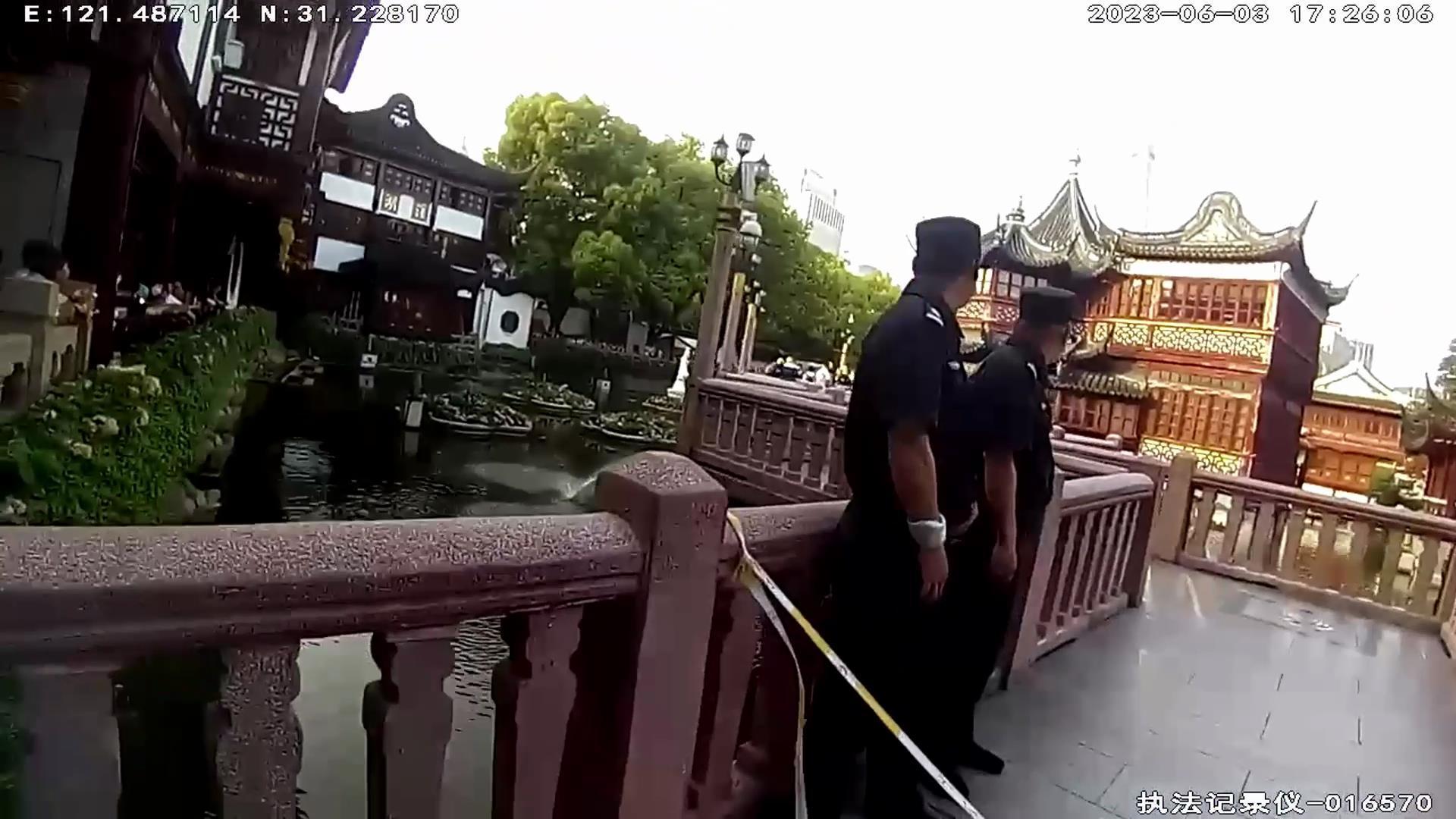 记录仪显示,民警在接到指挥室的指令后,立即一路小跑来到九曲桥上,要求豫园商城的安保人员对九曲桥采取临时封闭措施,疏散围观的游客。
