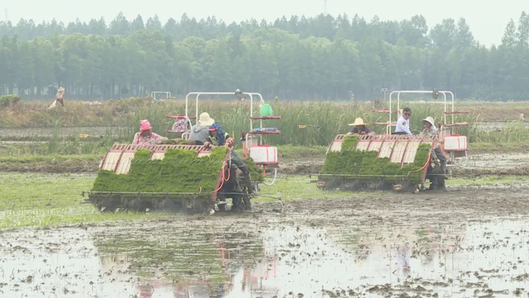 伴随着隆隆的机器声,农机手操作着插秧机在田间来回穿梭,插秧机驶过之处,一株株嫩绿的秧苗从苗盘上依次滑落,整齐均匀地植入泥土中。