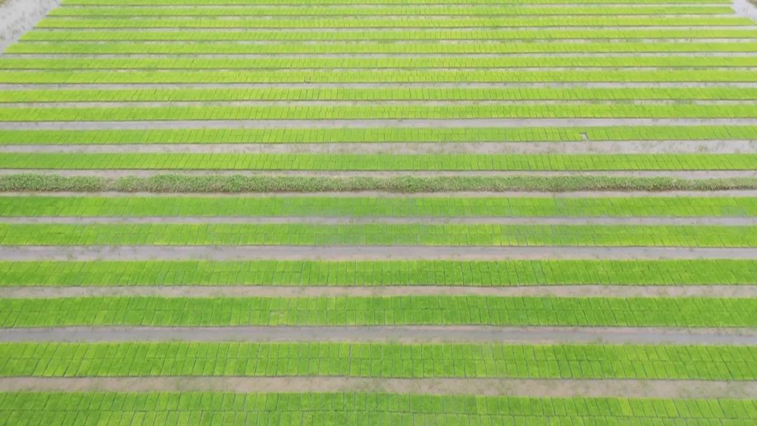 据了解,基地今年采取的是移栽秧苗的方式,一盘盘小秧苗从五月初开始种下,经过25天的生长周期,就可以从秧苗田里移栽到大田里,一亩地可以移栽30盘秧苗。这种种植方式便于苗期管理,能有效控制病虫害的发生,确保秧苗的质量。
