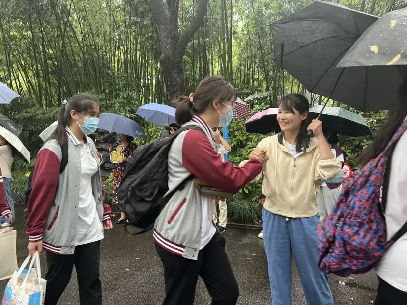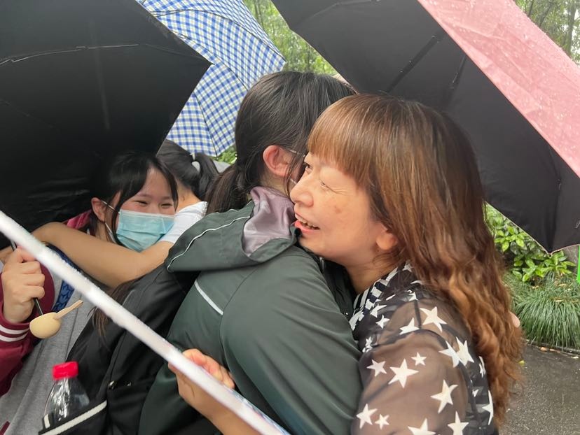中午12点,学生们纷纷走出校园,老师们撑着雨伞,在校门口依依送别:“老师我要抱抱,好舍不得您啊。”老师们流下了激动的泪水,一切不舍、期待、开怀都在雨水和泪水、拥抱和继续向前的脚步中,酝酿出最令人期待的明天。