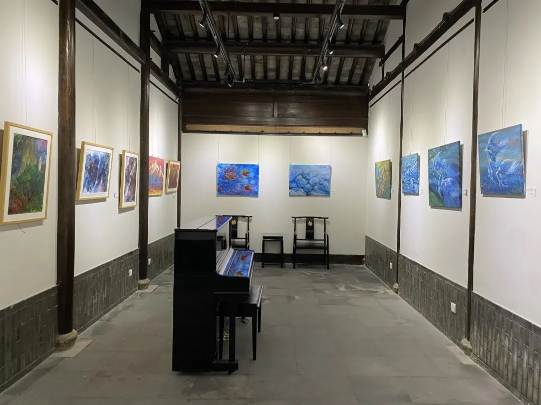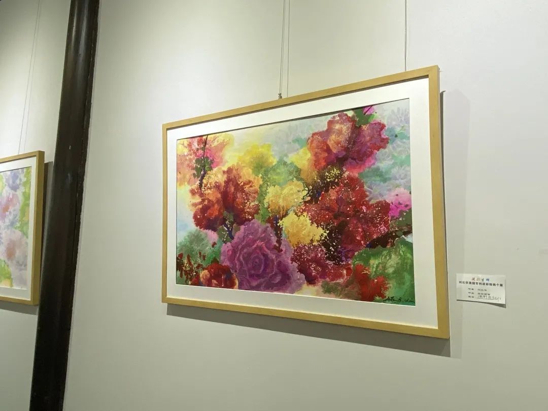 本次展览名为“流彩生辉——刘比华流彩绘画展”,共计展出美籍华裔艺术家刘比华近60幅流彩油画作品,包括“流彩石雕”“流彩山水”“流彩花卉”“流彩抽象”“涟涟游鱼”五个系列。艺术家将流彩绘画与国画泼墨法相结合,使之成为了一种中西合璧的艺术新形式。