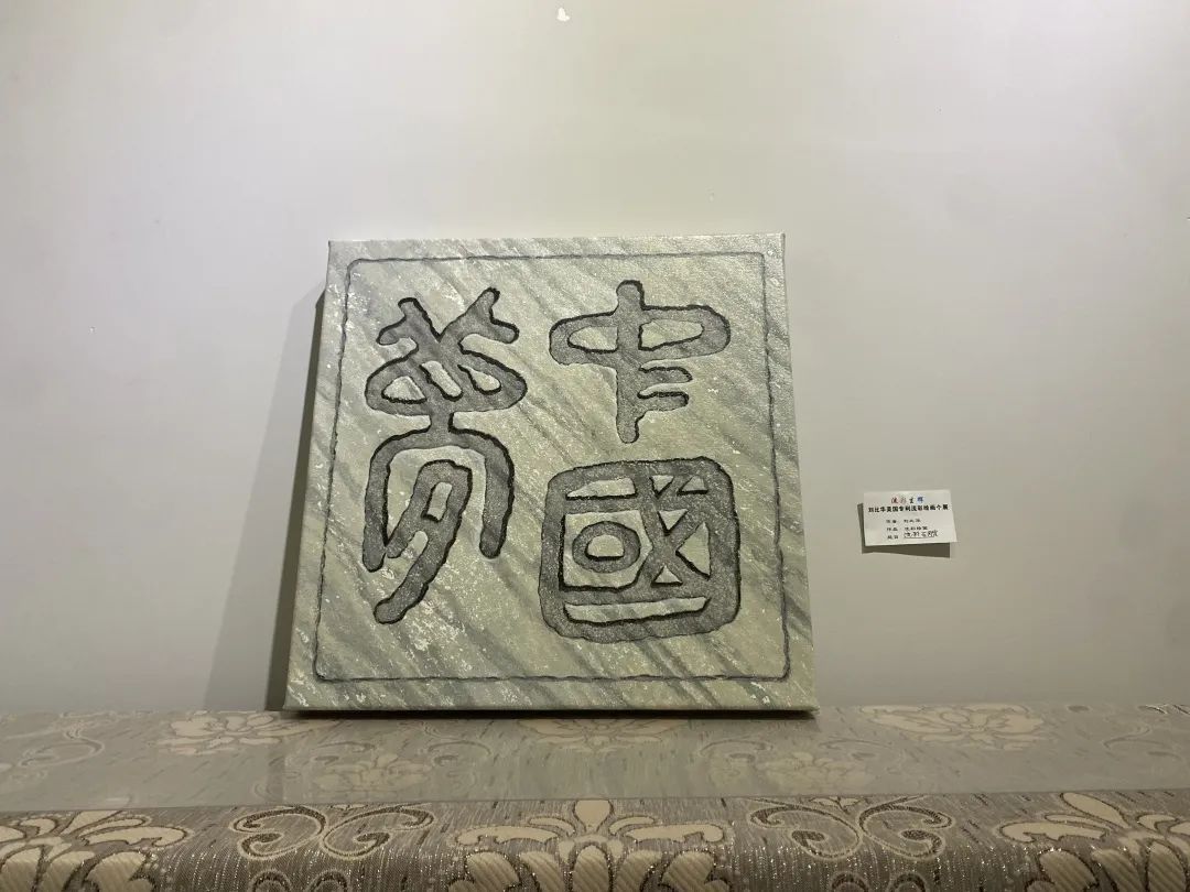 “中国梦是我回国举办画展的原因。在这幅‘中国梦’同名作品中,我将我父亲写的‘中国梦’三字书法印在油画布上,再做出了流彩的石头纹理,让文字看上去就像雕刻在石头上。”刘比华介绍。