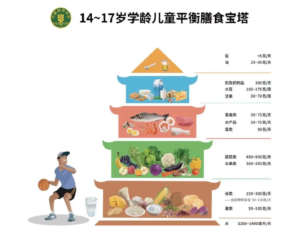 可以根据《学龄儿童平衡膳食宝塔》进行量化,按照不同年龄阶段学龄儿童的能量需求,分别有6~10岁学龄儿童平衡膳食宝塔、11~13岁学龄儿童平衡膳食宝塔和14~17岁学龄儿童平衡膳食宝塔。宝塔从下往上,共分为5层,包括谷薯类、蔬菜水果类、畜禽鱼蛋类、奶类大豆坚果类以及烹调用油盐。每层食物旁边的数字分别表明了每人每天各类食物建议摄入的克数。家长们可以选择适合自己小朋友的膳食宝塔,为他们“量身定制”饮食计划。比如,6~10岁学龄儿童每天谷类的摄入应达到150~200克、蔬菜类300克、水果类150~200克、荤菜类80克、奶类300克等。然后在此基础上,再进行食物种类的优化。