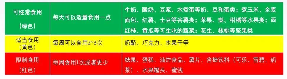 零食也分红、黄、绿灯。绿灯食物我们可以经常食用,也就是每天可以适量食用一点,比如牛奶、豆浆、玉米、红薯、水果等。黄灯食物我们只能适当食用,也就是每周可以食用2~3次,比如巧克力、水果干等。红灯食物我们要限制食用,每周食用1次或者更少,比如糖果、薯片、含糖饮料等。而且吃零食的量不应影响正餐为宜,两餐之间可以吃少量零食,饭前、饭后30分钟内不应吃零食,睡前30分钟也不应吃零食。