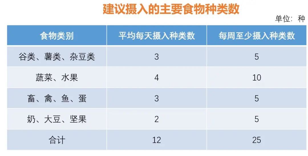 满足了“温饱”问题,还应做到食物多样,合理搭配,这样营养才够全面。《中国居民膳食指南》建议:平均每人每天不同的食物种类应达到12种以上,每周应达到25种以上,只有多种食物组成的膳食才能满足人体对各种营养素的需要。按照一日三餐分配比例,早餐至少摄入3~5种;午餐摄入4~6种;晚餐4~5种,才能达到营养均衡。