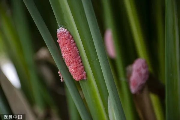 初产卵粉红色至鲜红色,卵的表面有一层不明显的白色粉状物,在5~6月的气温条件下,5天后变为灰白色至褐色,这时卵内已孵化成幼螺。
