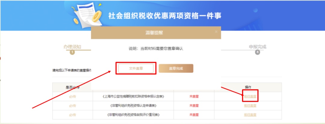 对系统生成的申请表,点击【前往盖章】-【文件盖章】,加盖电子签章。