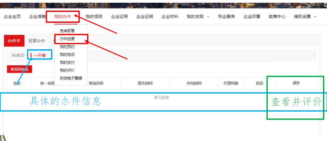 提交申请后,您可随时在【一网通办】-【我的办件】-【办件进度】里进行查询业务办理进度,并进行评价。