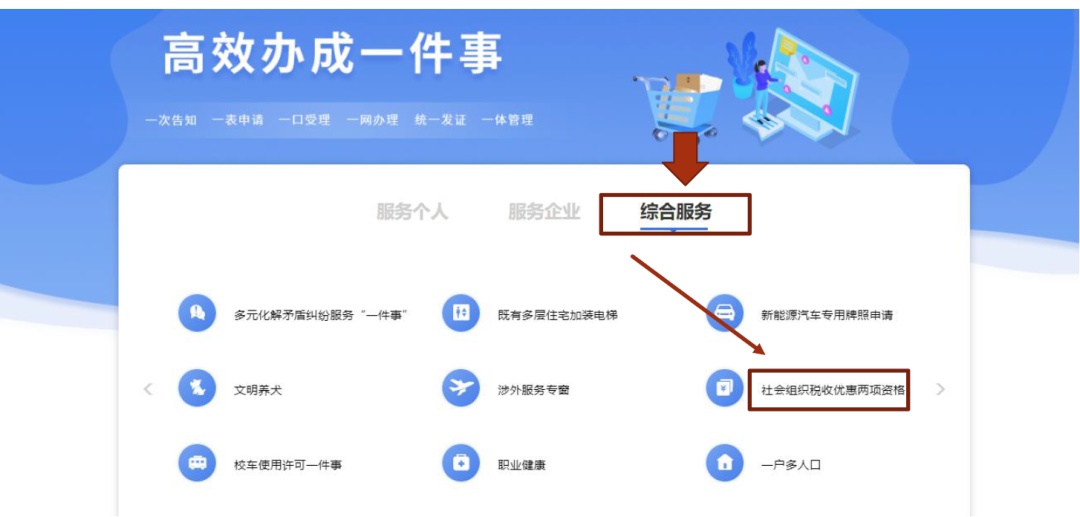 进入一网通办首页(地址:https://sh.gov.cn),选择【政务服务】-【特色专栏】-【高效办成一件事】-【综合服务】-【社会组织税收优惠两项资格】。并使用法人一证通或电子营业执照进行登录。