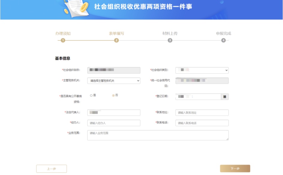 选择需办理的事项后,点击【确认】进入表单填写页面。 根据实际情况填写【基本信息】、【免税资格认定申请信息】、【免税资格认定自我评价】、【税前扣除资格认定】四部分内容。