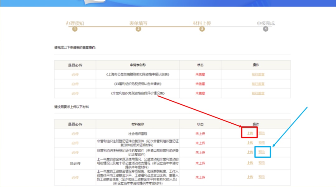 材料上传环节包括申请表盖章和其他材料上传两个部分。