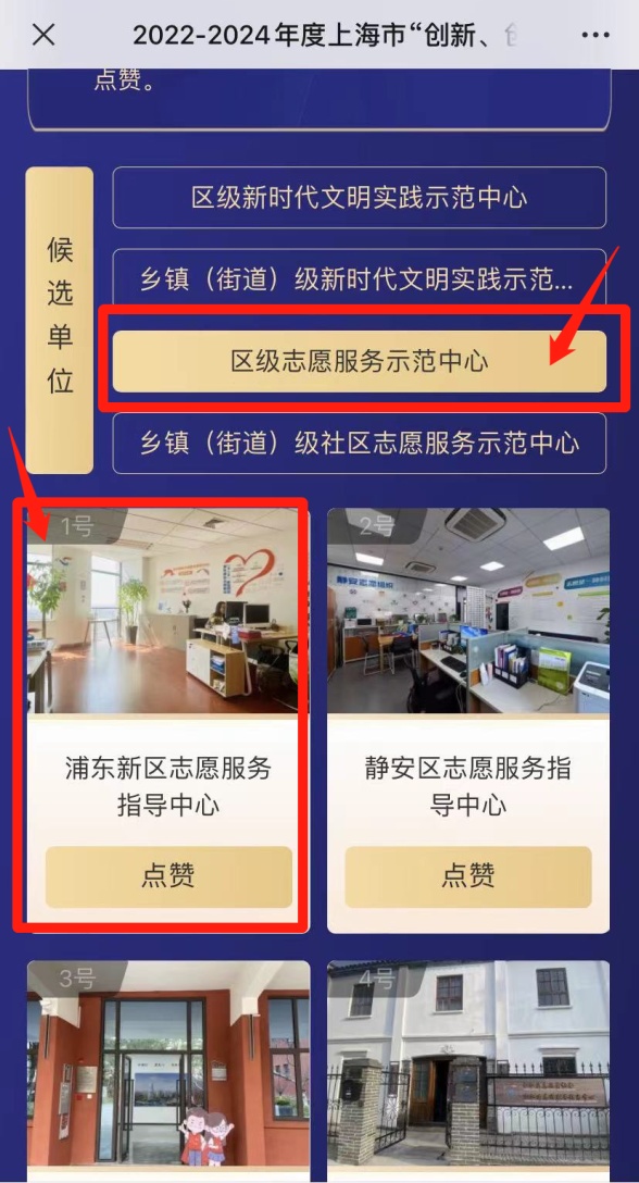 进入点赞页面,在“候选单位”中选择“区级志愿服务示范中心”,找到1号“浦东新区志愿服务指导中心”,点击“点赞”。