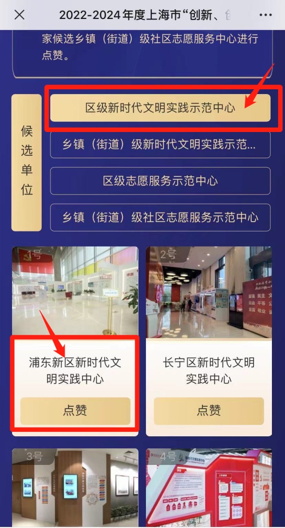进入点赞页面,在“候选单位”中选择“区级新时代文明实践示范中心”,找到1号“浦东新区新时代文明实践中心”,点击“点赞”。