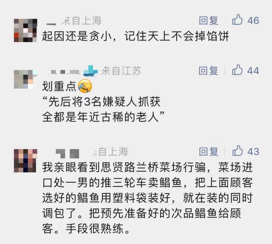 警方立即开展调查,通过现场走访,结合公共视频,很快发现摊主马某在路上售卖“开洋”时,与何阿婆一同挑选开洋的女子林某、祁某每次都会出现。一路循线追踪,民警掌握了三人的活动范围。5月19日下午,民警分别在江川路某小区以及博园路某小区内,将3名嫌疑人先后抓获,全都是年近古稀的老人。