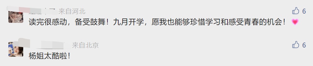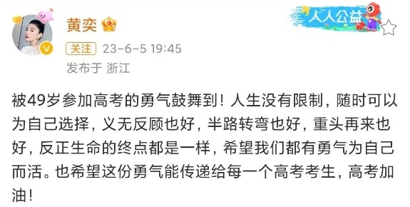演员@黄奕 看到杨玉江的故事后也备受鼓舞,转发博文支持她:“被49岁参加高考的勇气鼓舞到!人生没有限制,随时可以为自己选择,义无反顾也好,半路转弯也好,重头再来也好,反正生命的终点都是一样,希望我们都有勇气为自己而活。”