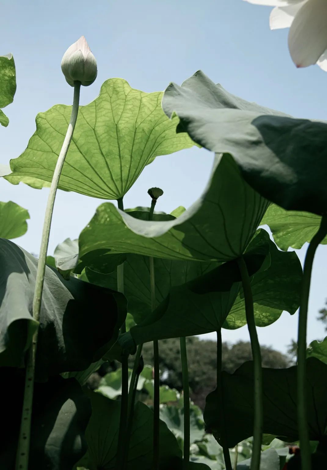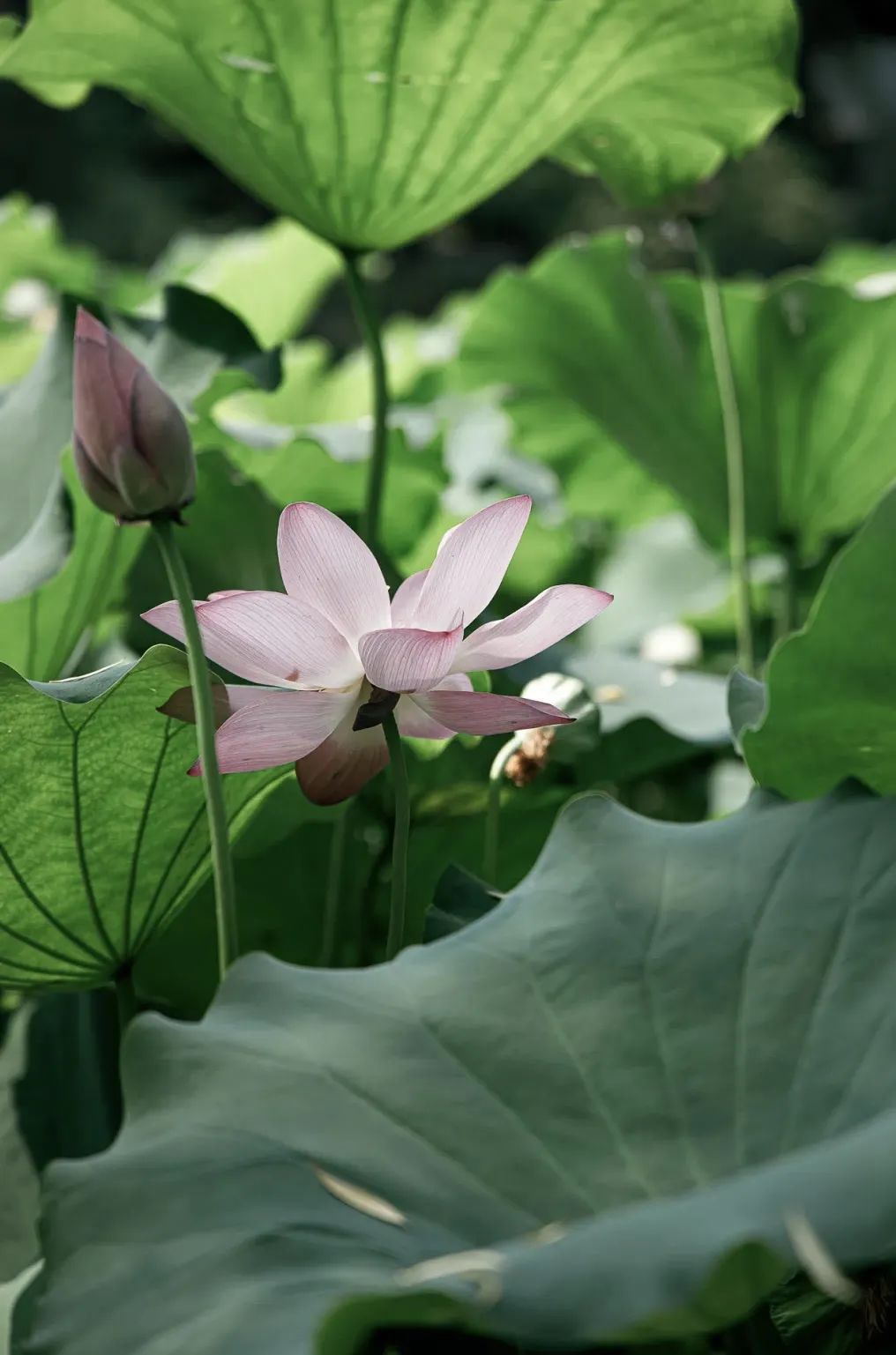 荷叶有舒有卷,荷花有开有合。一切不加雕饰,像是小女孩的纱裙,微风吹拂,荷叶轻摇,自然而美好。