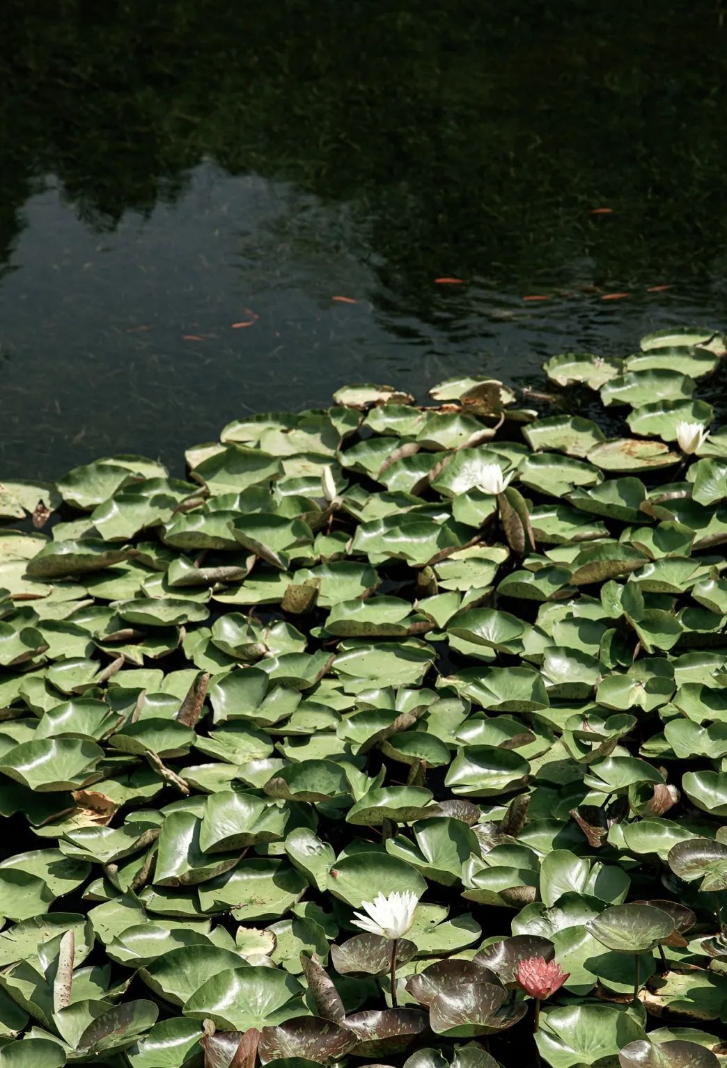 荷叶下若隐若现的小鱼,悠然其间,逍遥自得。时而在荷杆丛林中捉迷藏,时而在荷叶浓荫下荡秋千。
