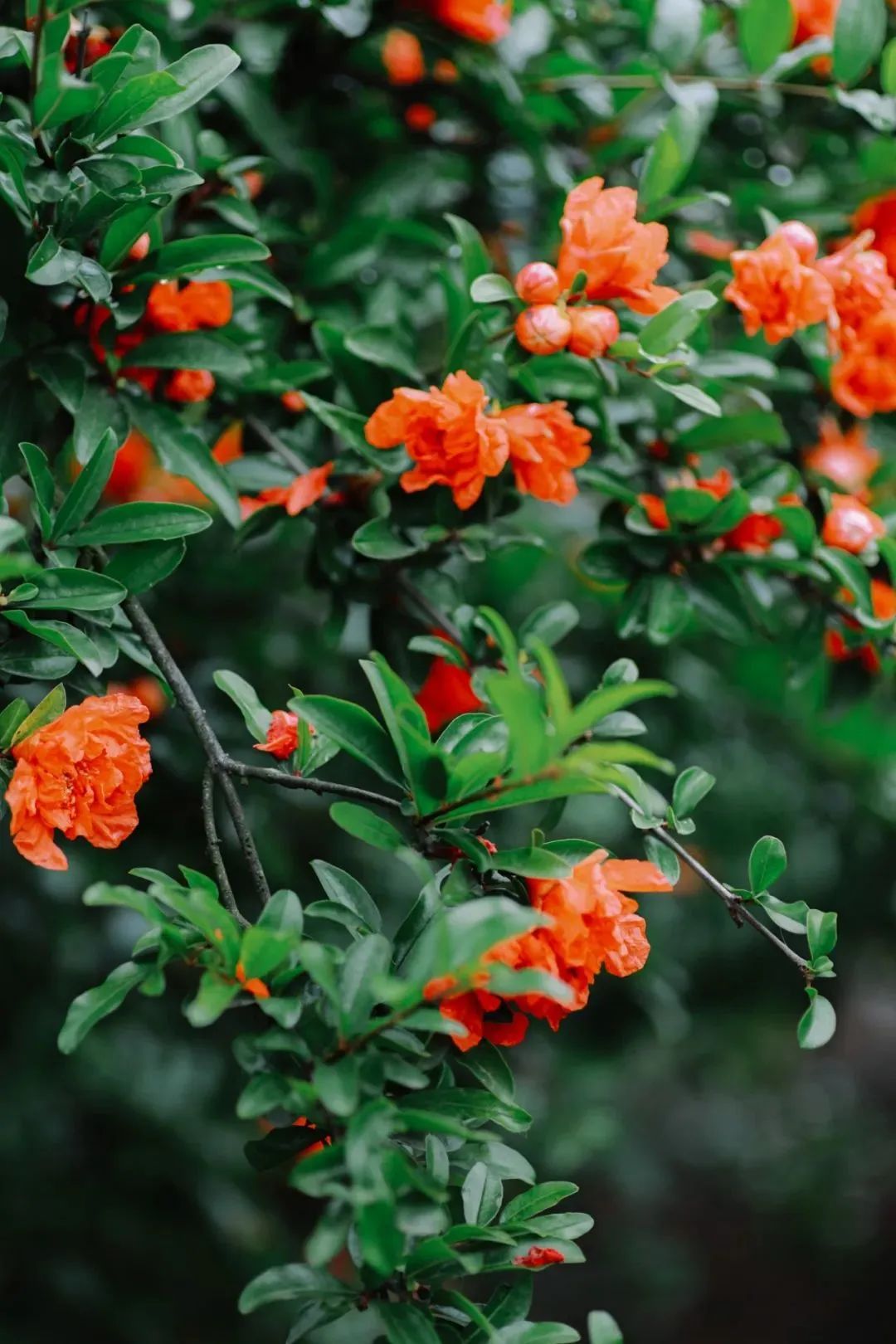 厚重的花萼上,折叠着丝绸般轻柔的花瓣,好似一个个红色小喇叭,点缀在秀气精致的翠叶间