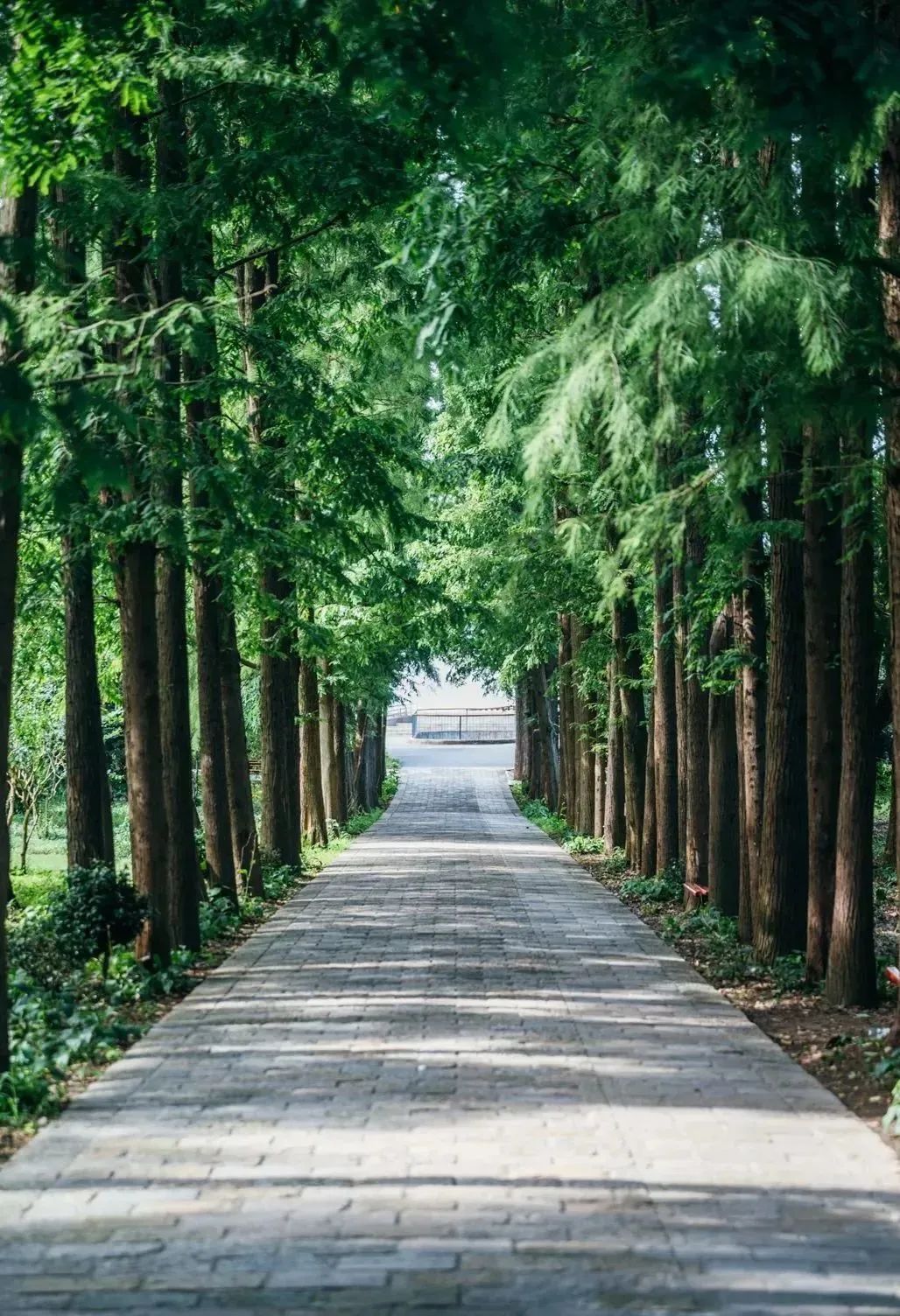 夏日里的水杉林郁郁葱葱,树木高耸挺拔,浓荫匝地,宛若原始森林般透着寂静。
