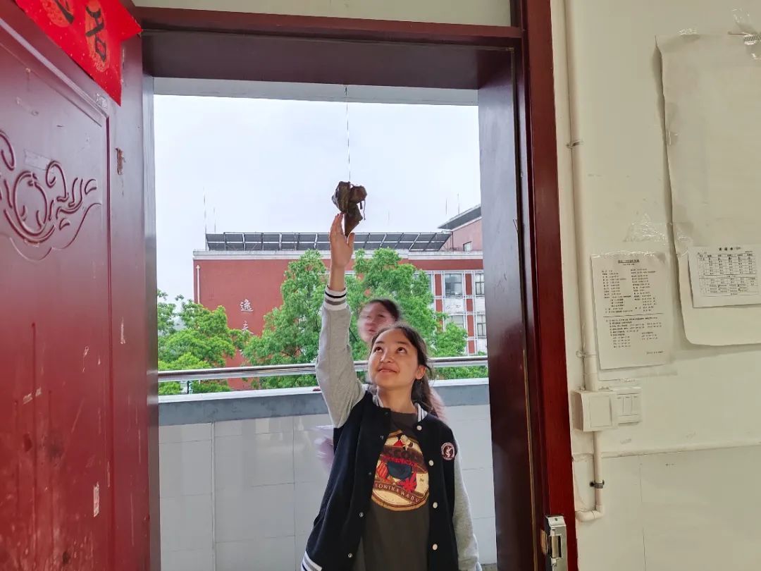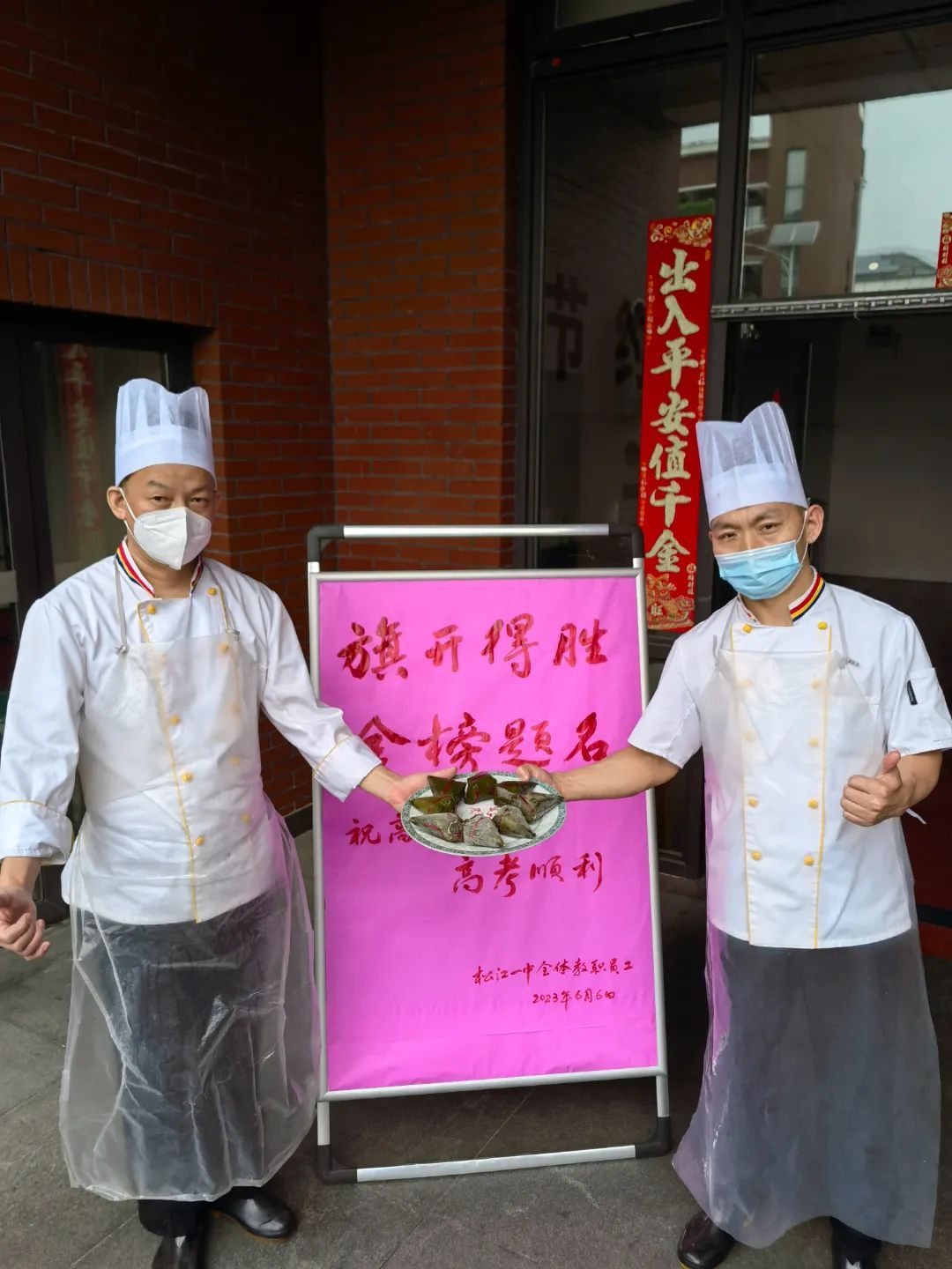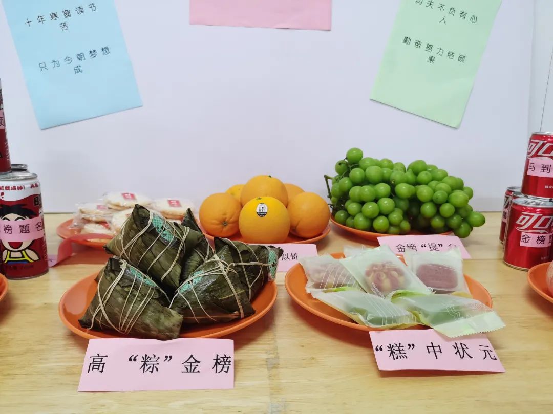 松江二中送上“苹”安、高“粽”祝福,松江一中送上一举高“粽”祝福,上师大外附中送上一马“苹”川祝福,华实高中的“祝福小礼袋”寓意“高粽”“定胜”,立达学校将寓意“一举高中”的粽子挂到了校门口。