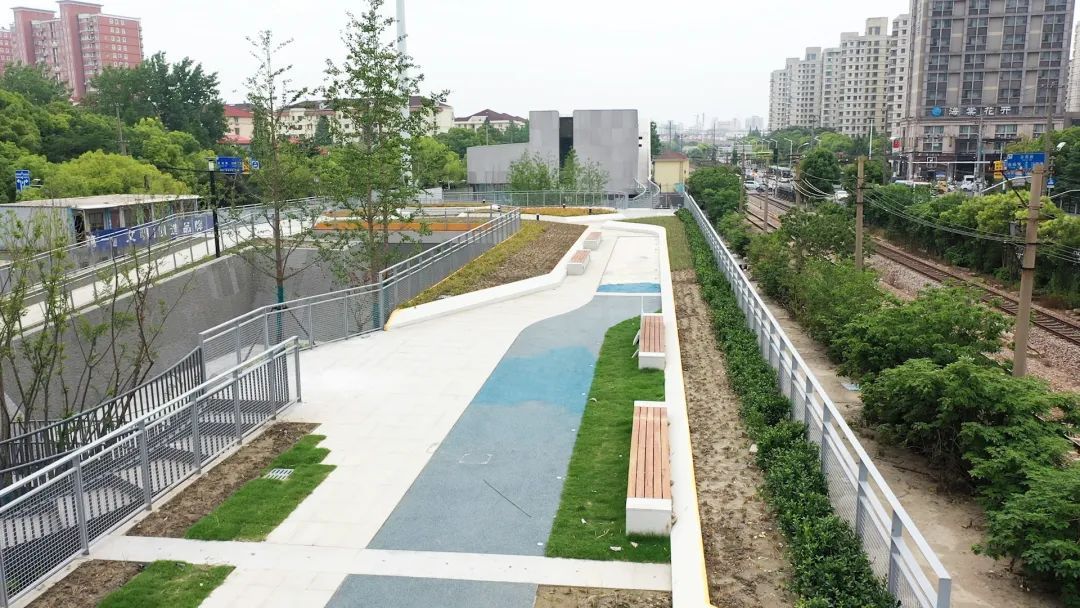 穿过架空层的停车场,顺着阶梯走上二层连廊,一条健身步道从脚下延展向前。行走在步道上,周围精心设计的大小景观和花草林木尽收眼底。这里是即将建设完成的新二路绿地,绿地东临新二路、西临高境路、南接殷高西路,占地10225.4平方米,整体为一片狭长区域。项目建成后将持续推动绿色空间与文化、科普、体育、休闲等城市功能深度融合,将成为城市绿肺、市民休憩的好去处。