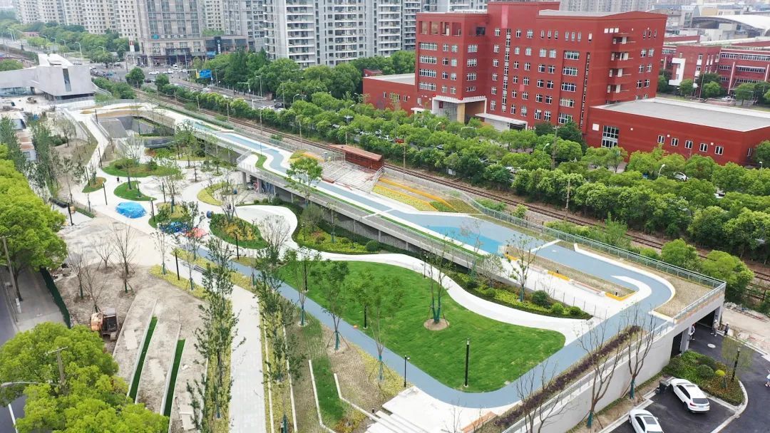 值得一提的是,新二路绿地特别设置了架空层,双层的设计是该项目的一大亮点。设计方利用地上架空层做空间布局,架空层下方作为停车及行车空间,包括普通车位和新能源停车位若干。绿地的二层部分为架空长廊,包括150米的健身步道和部分景观小品。