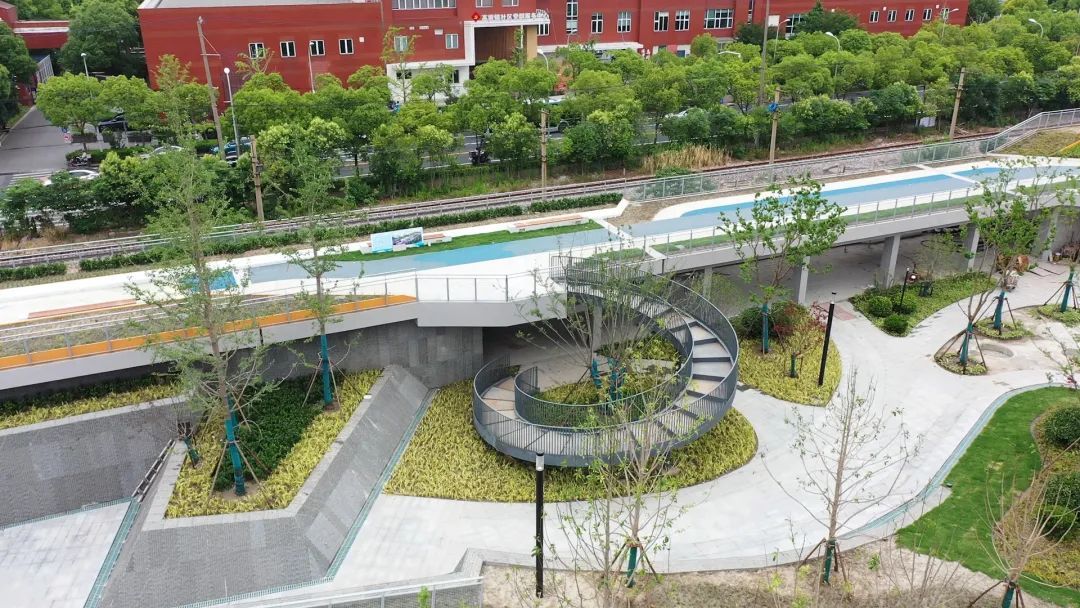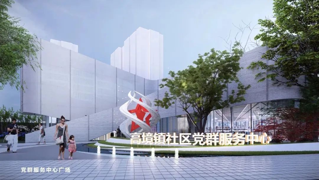 此外,绿地的西南侧还建有高境镇党群服务站。作为高境镇社区党群服务中心B区,服务中心力求建设全时段全龄友好共融空间,围绕居民、新就业群体等不同人群的需求,突出党群阵地政治功能基础,融入社区共融营造工作室、24小时智慧社区办事厅、社区图书馆、社区餐厅等功能,致力让党建元素嵌入城市肌理、市民乐享美好生活。