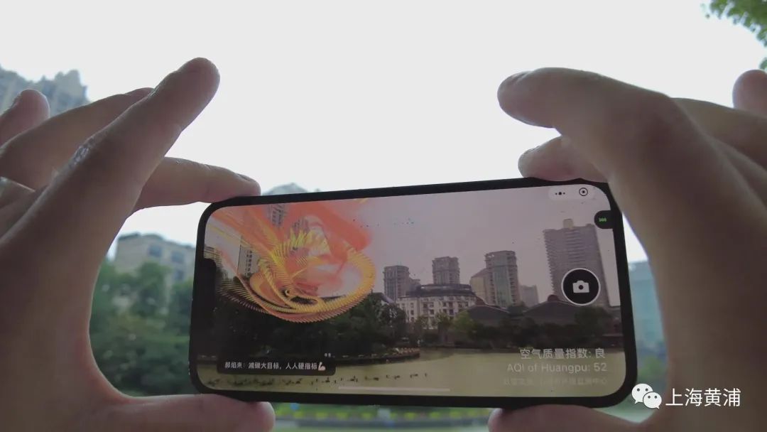 最近路过太平湖附近的市民,可以在湖边的树下看到蓝、绿、红三个方块,上面有着二维码,通过手机刷码,就能拍摄到这个用数字技术打造的虚拟“星云”出现在太平湖上,它们在空中缓缓漂浮,将日夜光影的交织变化呈现在市民面前。