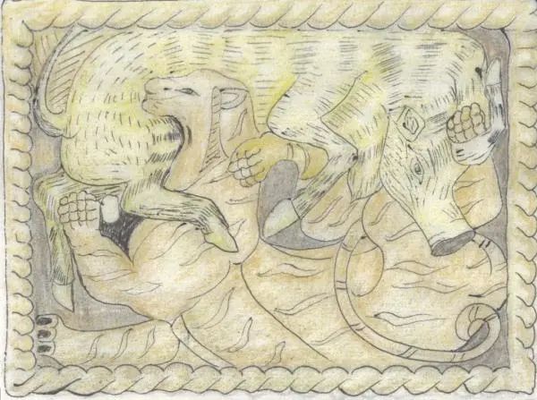 △虎豕(shǐ)咬斗纹金饰牌素描图
