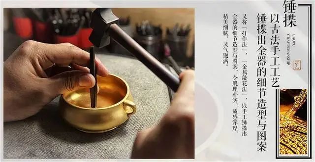 锤揲:最主要的金银器成形工艺。这种工艺可充分利用了金、银质地比较柔软、延展性强的特点,用锤敲打金、银块,使之延伸展开成片状,再按要求打造成各种器形和纹饰。