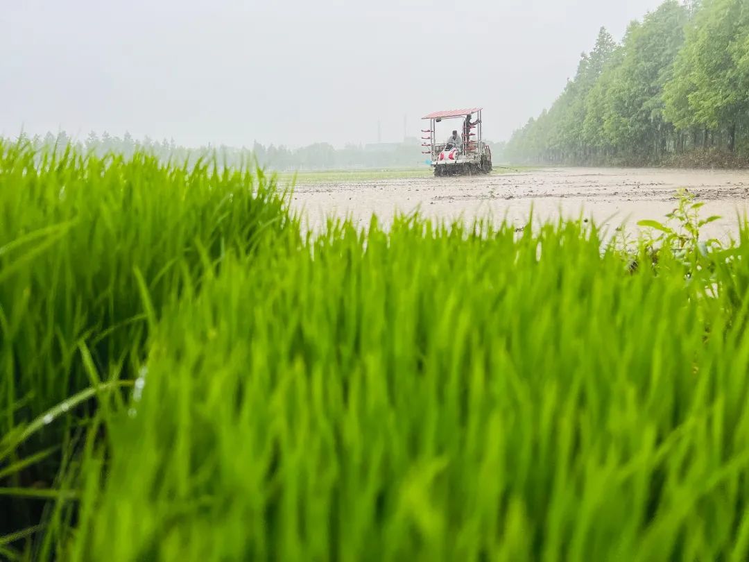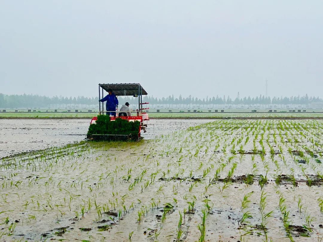 近日,虽然雨水不停,但罗泾镇花红村千亩粮田已插下第一批秧苗。