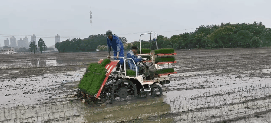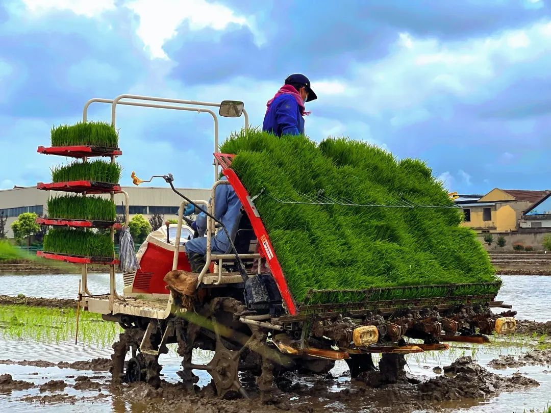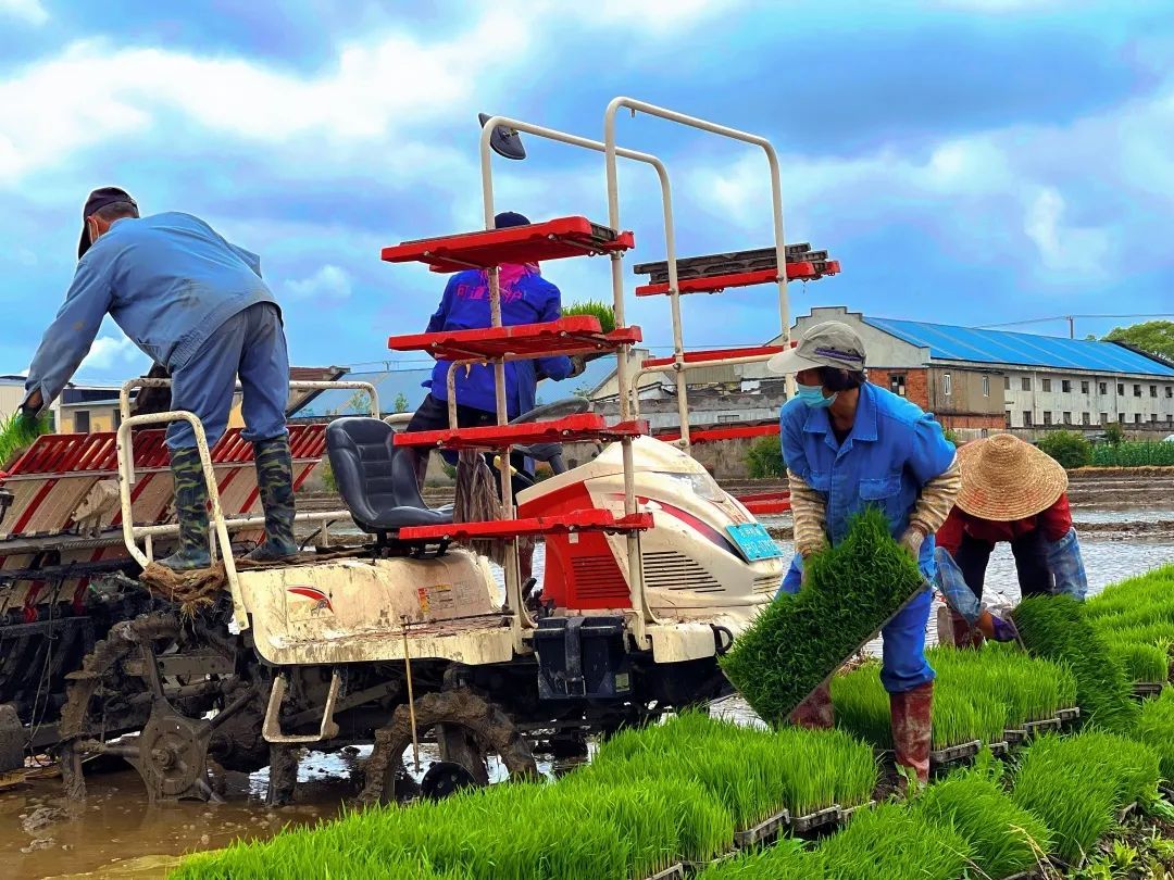 农田里,这些高级农技师正在忙着调整插秧机的插秧密度。他们在田间打浆、运苗、插秧,处处是一派热火朝天的播种景象。