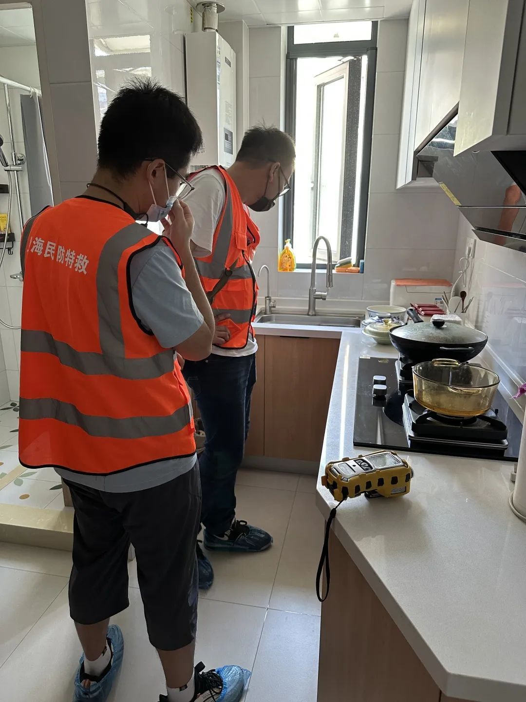 早上9点,总队的专业检测志愿者先来到了周女士家中。虽然没有进行新装修,但是居民自述会闻到异味,有时会头晕。检测人员首先考虑煤气泄漏和下水道异味的问题,经专业仪器检测,确实存在煤气泄漏情况。检测人员指导居民马上开窗通风,并尽快拨打燃气热线,请专业人员上门维修。