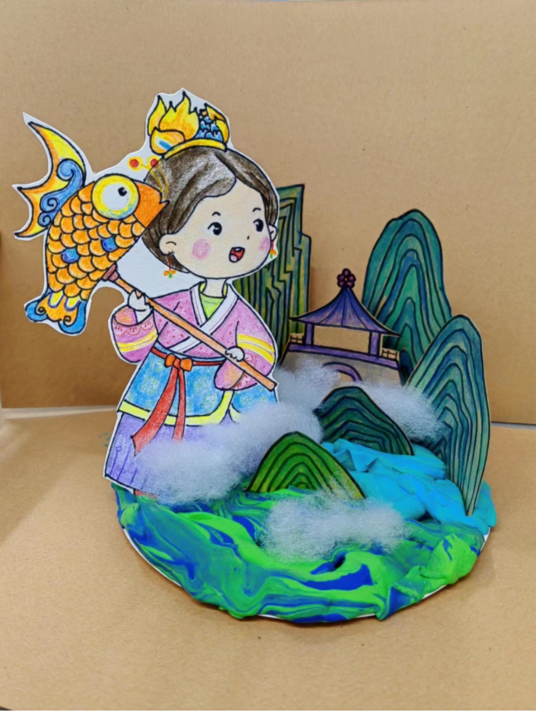 为了适配孩子们的年龄,朵云轩指导老师在活动中选用了圆形和三角形的几何图形来组合人物形象,并加上扇子和荷叶等古风道具装饰,用简单可爱的图形开拓孩子们的艺术思维,让他们喜欢上非遗文化。通过简单的绘画、涂色、描边、粘贴等步骤,学生们制作出了有棱有角、色彩层层渐变的小山,方方正正的亭台楼阁,蓝绿交织的轻黏土铺成大地,以及体现仙气精髓的几朵腈纶棉絮搓成的白云。