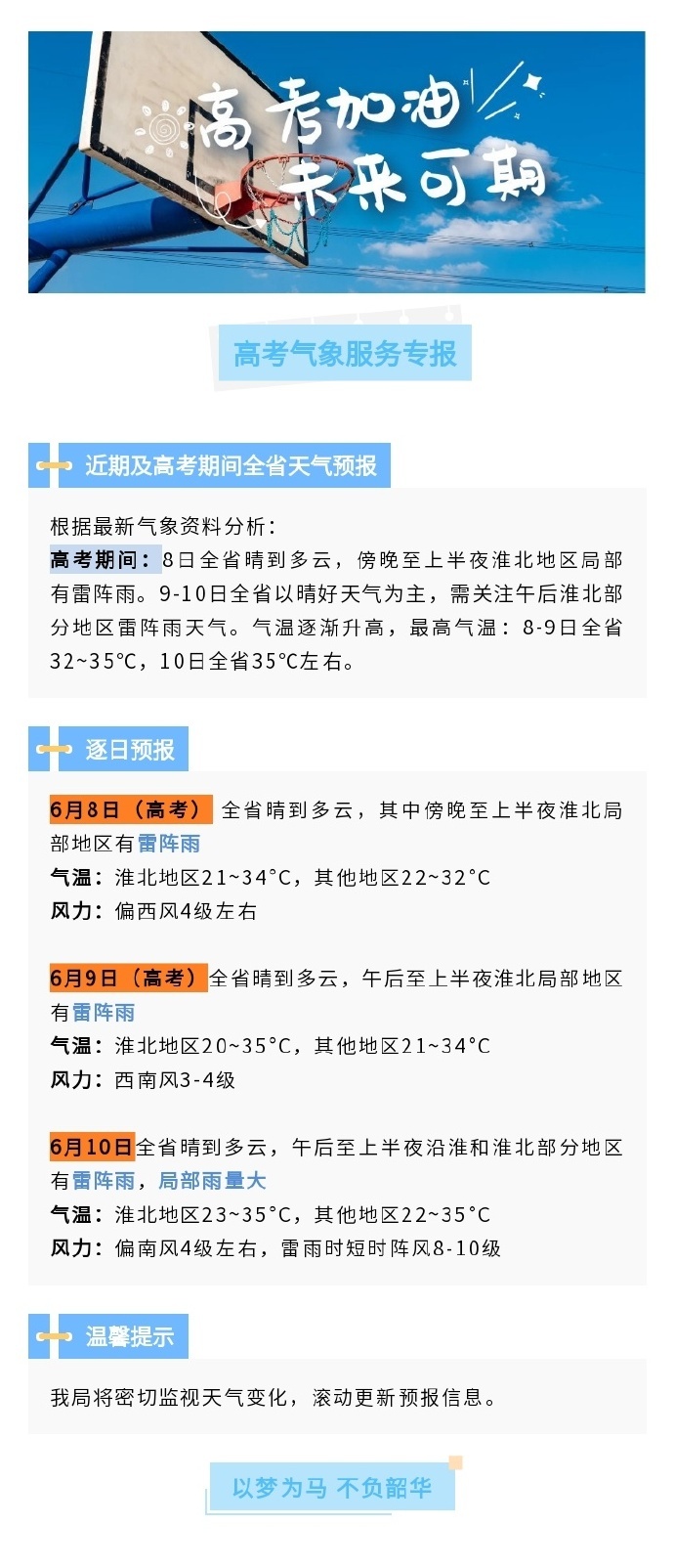 据江苏省气象台发布的高考气象服务专报,根据最新气象资料分析,高考期间:8日全省晴到多云,傍晚至上半夜淮北地区局部有雷阵雨。9-10日全省以晴好天气为主,需关注午后淮北部分地区雷阵雨天气。气温逐渐升高,最高气温:8-9日全省32~35℃,10日全省35℃左右。