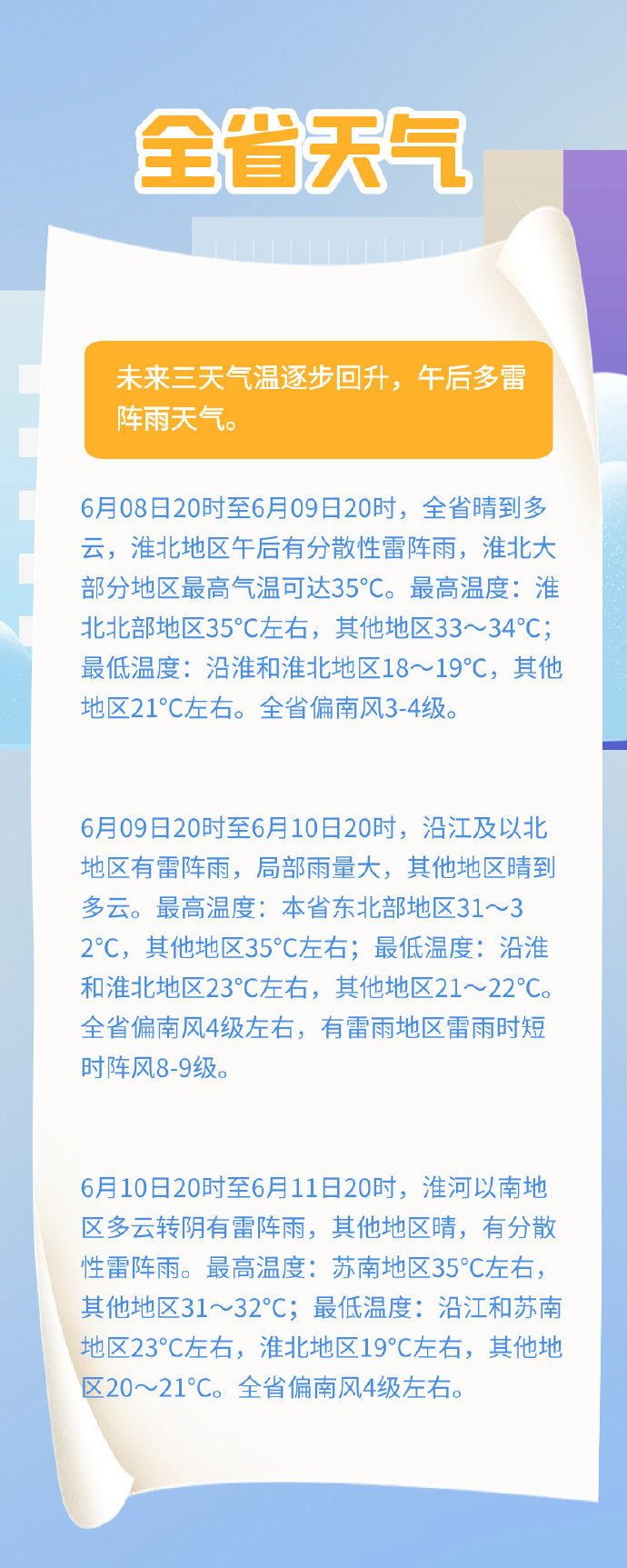 具体来看,未来三天气温逐步回升,午后多雷阵雨天气。6月08日20时至6月09日20时,全省晴到多云,淮北地区午后有分散性雷阵雨,淮北大部分地区最高气温可达35℃。最高温度:淮北北部地区35℃左右,其他地区33~34℃;最低温度:沿淮和淮北地区18~19℃,其他地区21℃左右。全省偏南风3-4级。