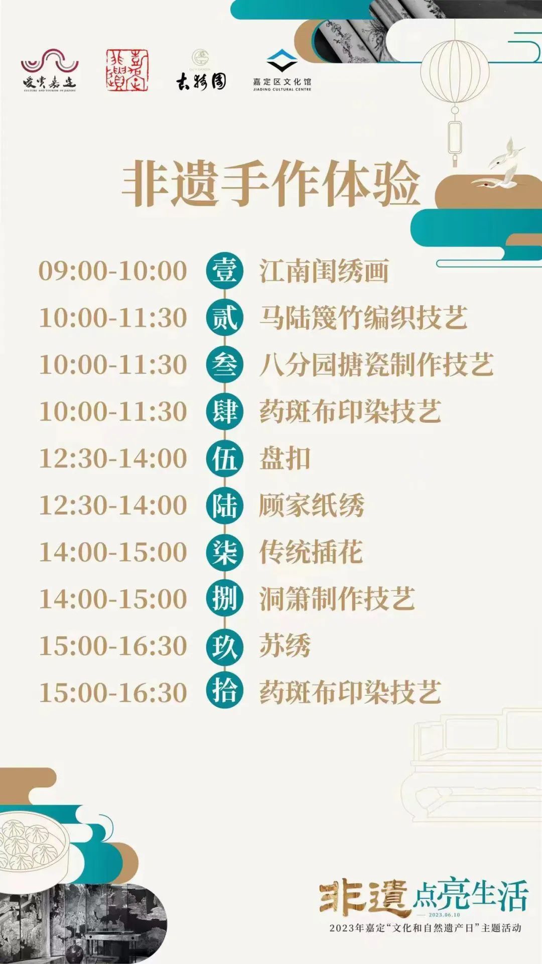 江南闺秀画、马陆蔑竹编织技艺、八分园搪瓷制作技艺、药斑布印染技艺、盘扣等将在当日上午轮番开放手作体验;顾家纸绣、传统插花、洞箫制作技艺、苏绣也在当日下午相继对预约报名的市民游客开放。