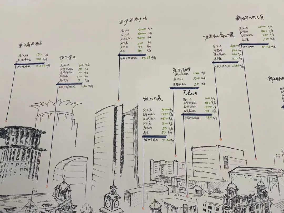 执法检查中,有代表留意到墙面上的手绘地图,上面标志着南京东路黄金商圈内主要建筑物楼宇的“绿色足迹”,包括每月的可回收物种类、产生量及换算成的碳减排量,都一一直观呈现。