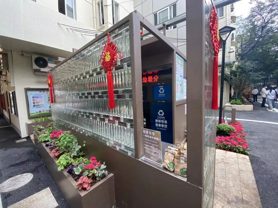 如今,当人们再度步入山北小区,简单的垃圾箱房注入充满艺术感的鲜活表达。首先映入眼帘的是白色亚克力玻璃组成的“社区玄关”,上面摆放着一排精心打理过的绿植花卉盆栽,姹紫嫣红的错落搭配,令人感受到一股扑面而来的生活气息。一旁还放置着一袋袋牛皮纸精心包装好的咖啡渣,并细心标注天然除臭剂、天然除虫剂等生活妙用。