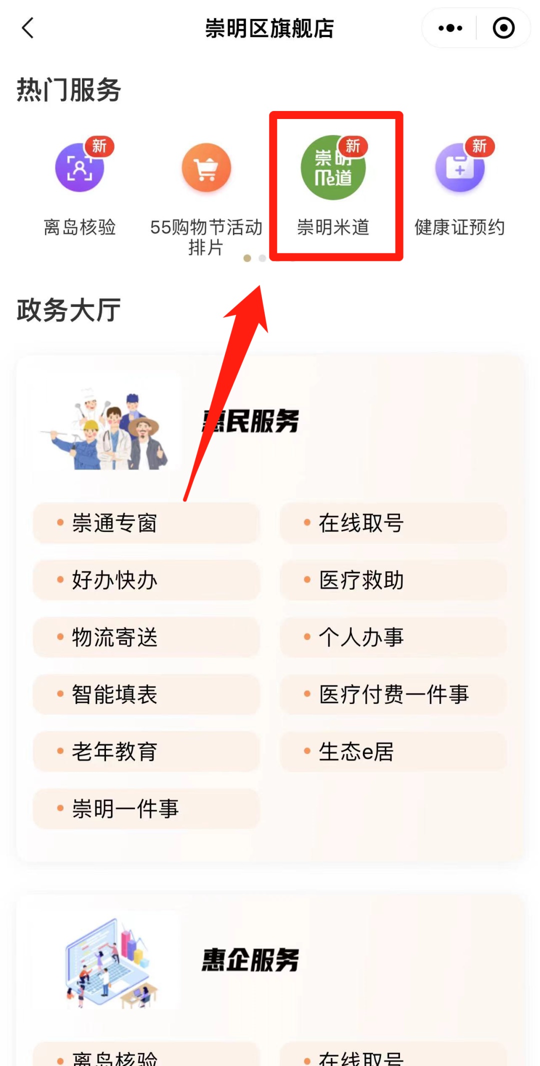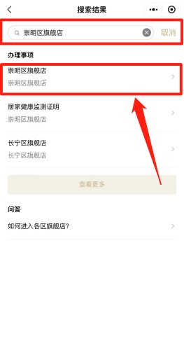 微信搜索“随申办”微信小程序,完成实名登录后,点击搜索“崇明旗舰店”进入主页。