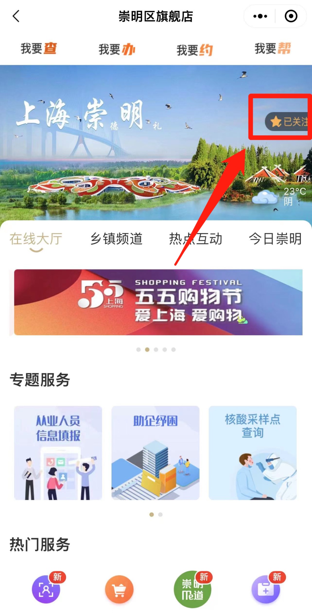 进入崇明旗舰店后先点击右上角“关注”(后续可以进入首页“发现”频道直接找到崇明旗舰店),然后找到“崇明米道”服务,点击进入。