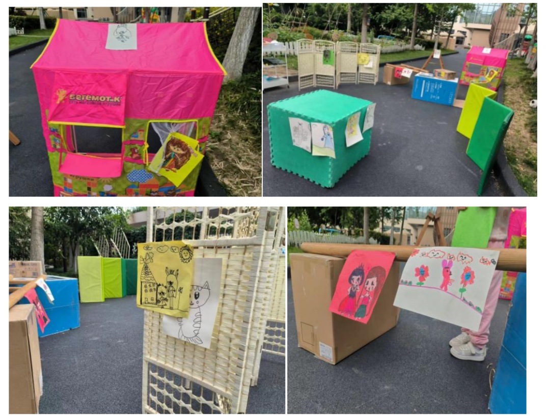 园长徐臻回忆道,在布展时,孩子们遇到了不少难题,比如“作品太少了,撑不满一面墙怎么办”“摆放形式有点单一,好像缺了点装饰”“展览是在室外,下雨了怎么办”等等。