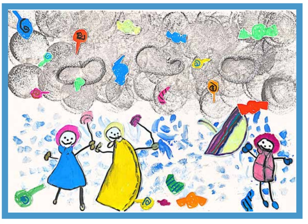 郭家钰小朋友说:“我画的这幅画叫《下雨天》,天上还掉下了很多糖果,三个小人在雨中跳舞。”