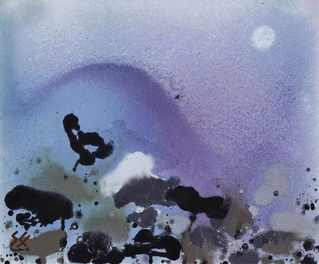 除了表现荷塘在自然环境中的不同景象外,作者还善于在倒影上做文章,油画《明月出云崖》描绘的是荷塘月色,背景中的颗粒感加上渐变的蓝紫色,将水面的波光流溢描绘得惟妙惟肖,明月、翠盖、山崖的倒影轮廓松散,散落其间,仿佛有风拂过,显得分外幽静安宁。